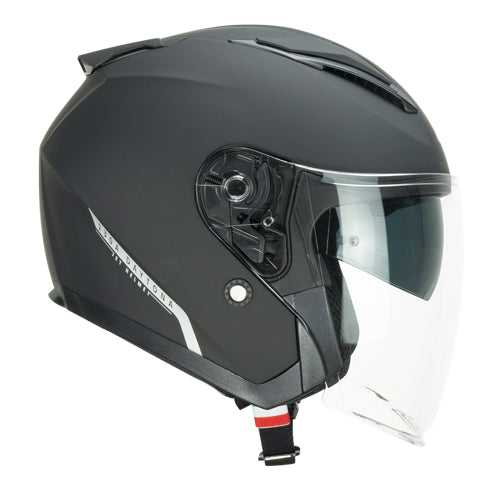 The CGM 130A Daytona Mono helmet is equipped with a long external visor for greater protection from the wind, with an expanded field of vision and with a predisposition for a PINLOCK lens. It features a ventilation system that uses the front air intakes to channel the air inside the helmet and expel the hot air from the rear extractors. The features are completed by the removable, thermoformed interiors with reflective bands and the internal extra-fumè retractable glasses.