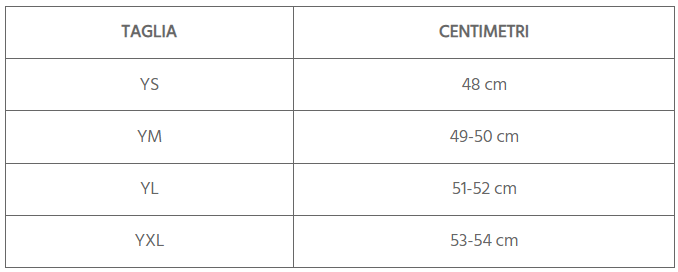 - Taglie: YS (48cm), YM (49-50cm), YL (51-52cm), YXL (53-54cm)