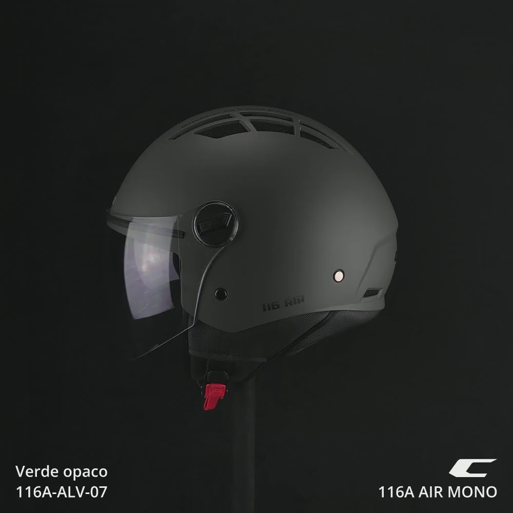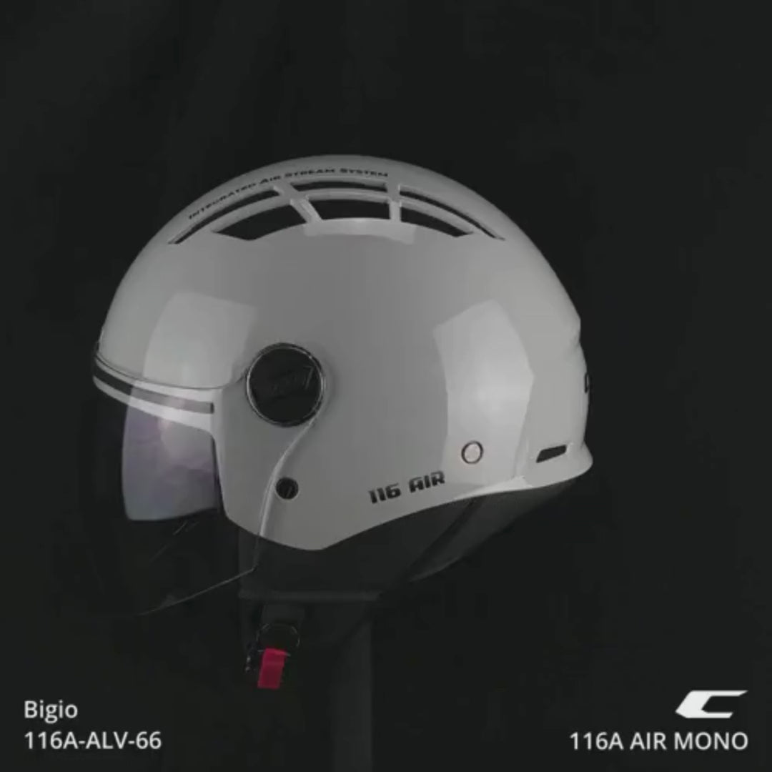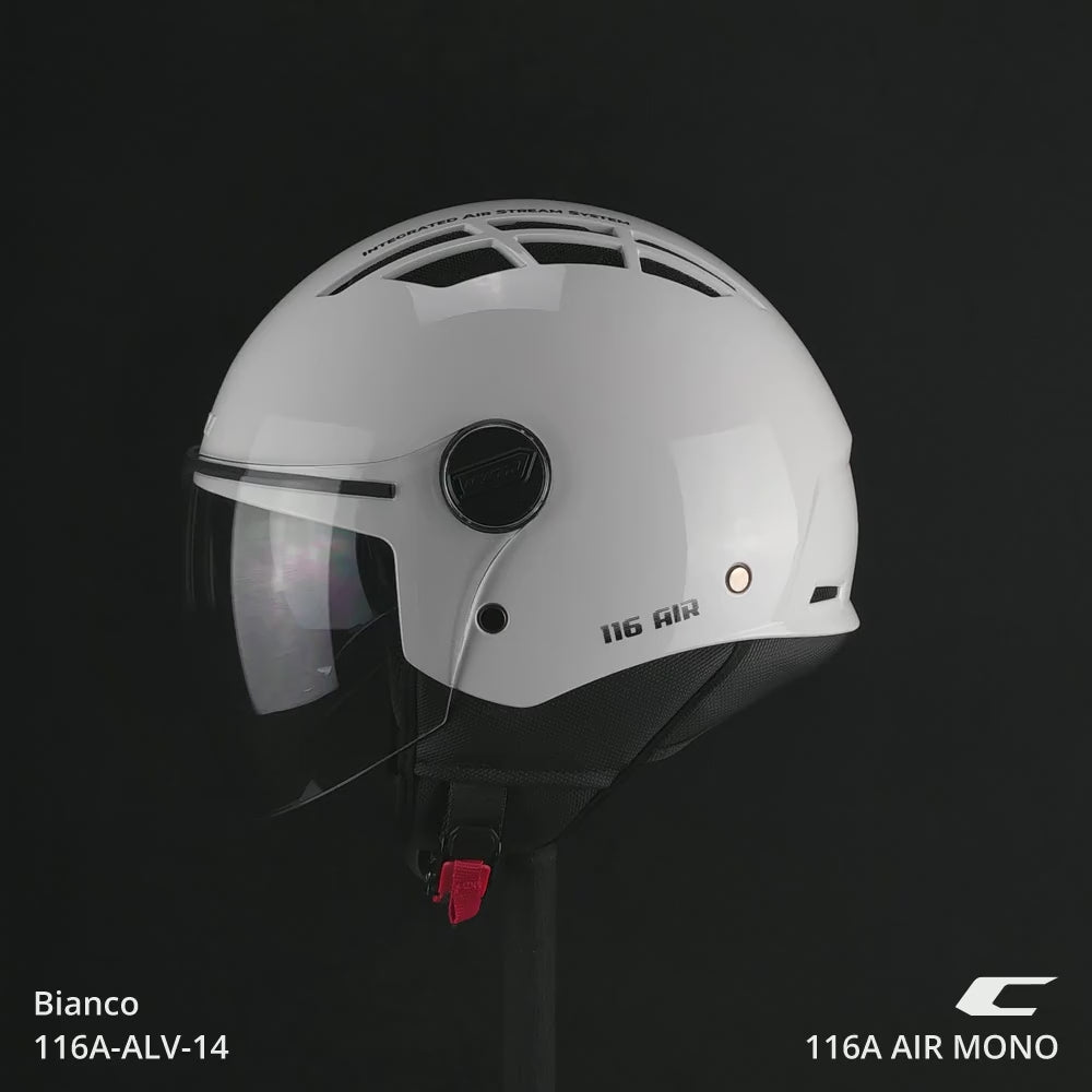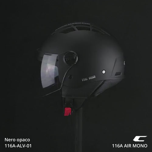 Il 116 AIR è realizzato in due misure di calotta esterna in HPT (High Performance Terpolymer) e con quattro calotte interne in EPS multidensità. Dispone inoltre di visiera interna parasole a scomparsa, interni termoformati, guanciali e sottomento realizzati con tessuto antiallergico e antibatterico facilmente removibili e lavabili.