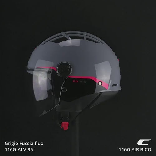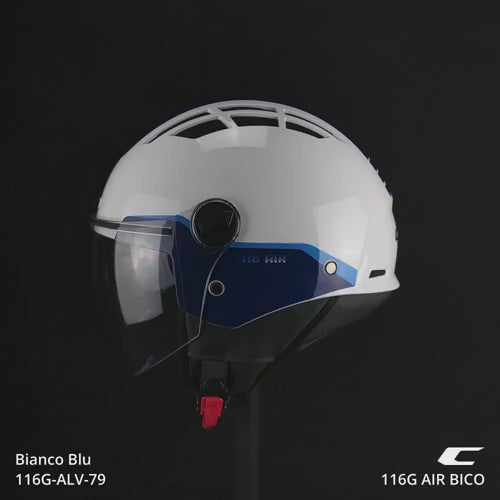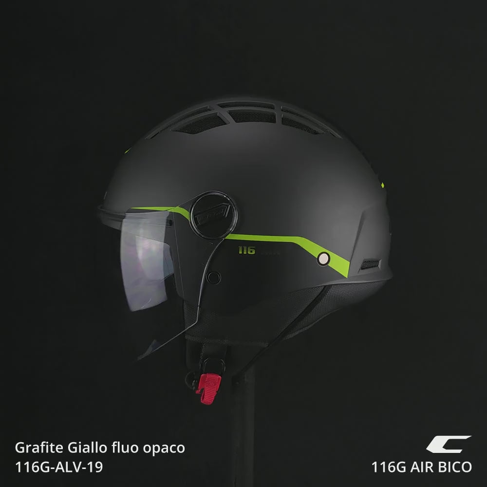 Il 116 AIR è realizzato in due misure di calotta esterna in HPT (High Performance Terpolymer) e con quattro calotte interne in EPS multidensità. Dispone inoltre di visiera interna parasole a scomparsa, interni termoformati, guanciali e sottomento realizzati con tessuto antiallergico e antibatterico facilmente removibili e lavabili.
