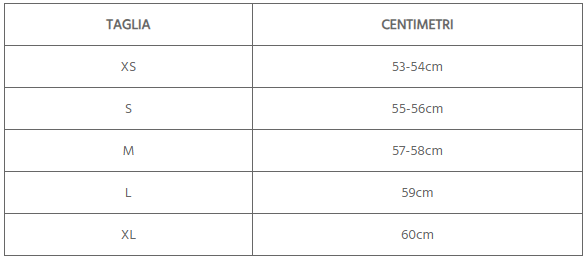 - Taglie: XS (53-54cm), S (55-56cm),M (57-58cm), L (59cm), XL (60cm), XXL (61cm)