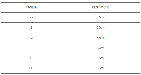 - Taglie: XS (54cm), S (55cm), M (56cm), L (57cm), XL (58cm), XXL (59cm)