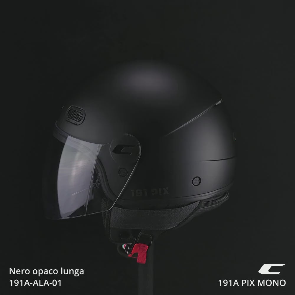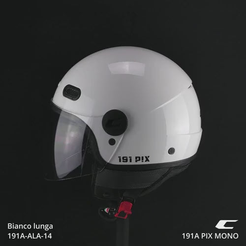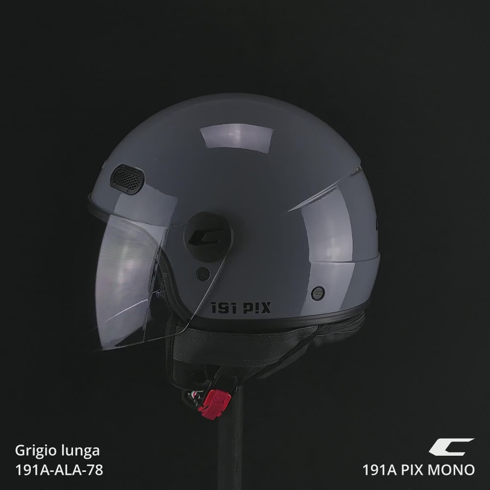 Ispirato allo stile classico italiano che ci contraddistingue da sempre il 191 PIX è un semi-jet estremamente compatto e leggero. Si differenzia dal tradizionale casco sferico grazie alle prese d'aria anteriori in metallo e ai tagli posteriori della calotta che alloggiano anche gli estrattori d'aria. Gli interni termoformati, completamente estraibili e lavabili sono provvisti di sottomento e collarino paranuca removibile con zip e, in tutte le varianti grafiche, impreziositi da dettagli in ecopelle marrone dallo stile vintage. Il PIX può essere equipaggiato con visiera lunga per una maggiore protezione dal vento o con visiera sagomata dalle linee moderne, le visiere intercambiabili tra loro condividono il sistema di fissaggio che nelle versioni con grafica è in metallo. Completano le dotazioni del casco la fibbia micrometrica, l'anello antifurto, l'elastico fermacinturino e nelle varianti con grafica il passa occhiali posteriore.