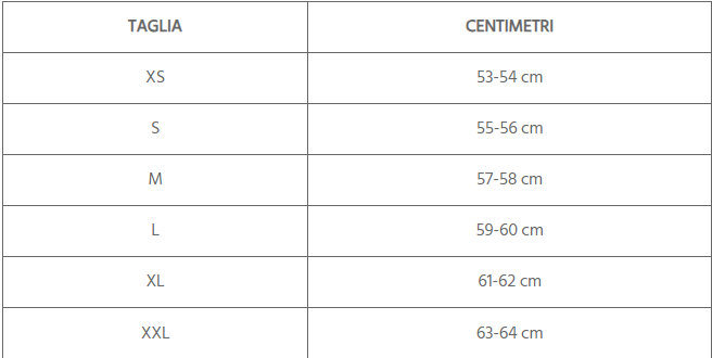 - Taglie: XS (53-54cm), S (55-56cm),M (57-58cm), L (59-60cm), XL (61-62cm), XXL (63-64cm)