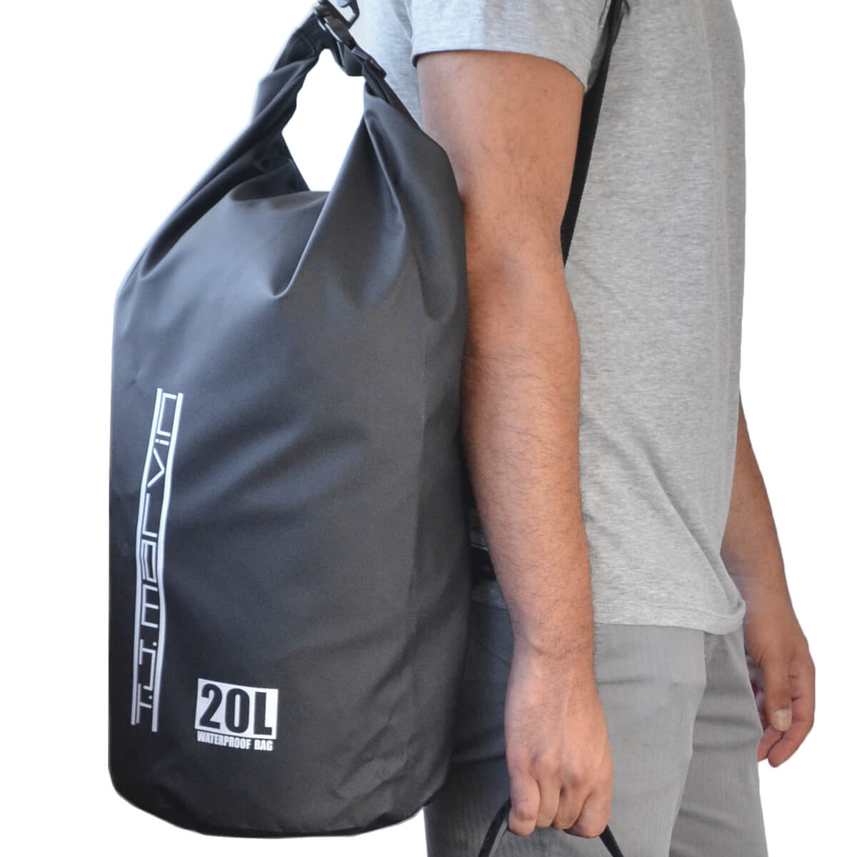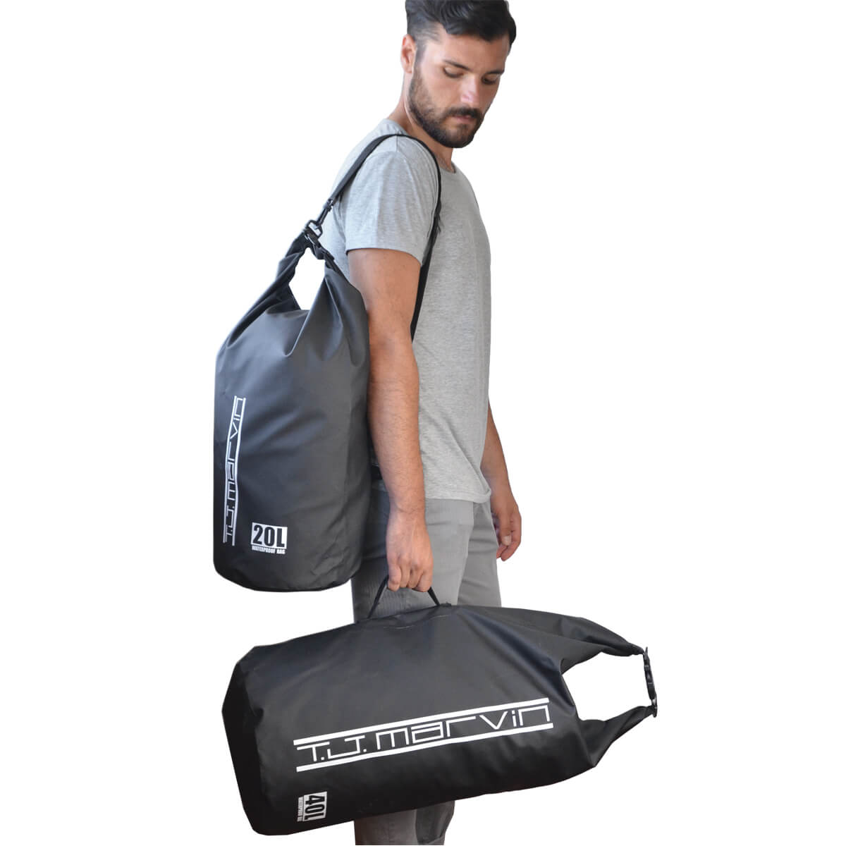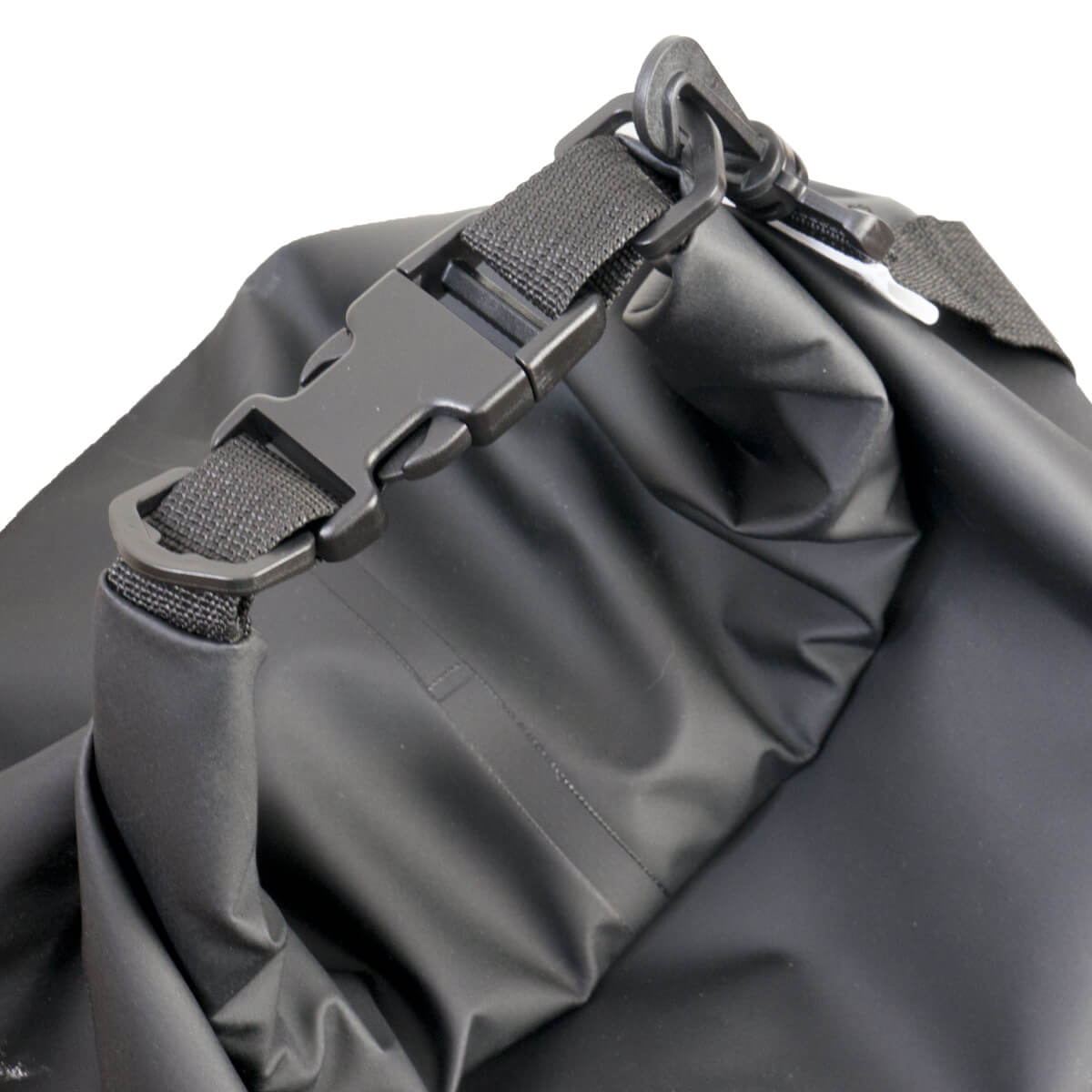 PVC waterproof bag. Equipped with heat-sealed seams and a watertight fold-over closure. Removable adjustable shoulder strap and reinforced non-slip handle. Two elastic straps included. Available in size S of 20 liters and size L of 40 liters.