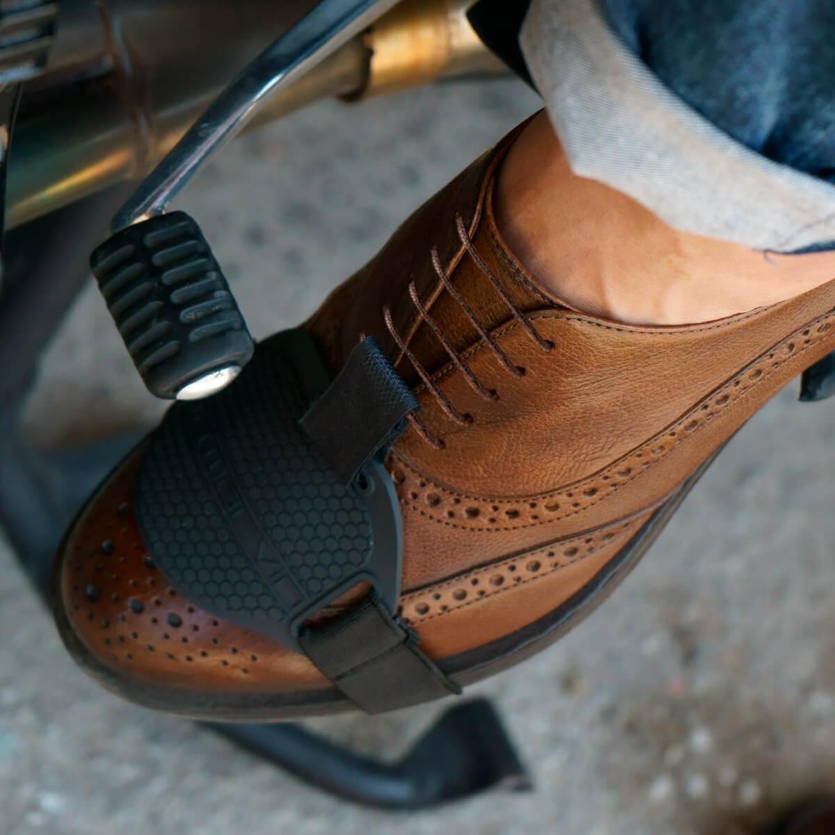 Universal shoe saver made of wear-resistant, non-slip and flexible rubber. Protects the shoe by avoiding direct contact with the gear lever. Suitable for all sizes and easy to wear. Two fastening methods with elastic band behind the heel or with Velcro on the shoelaces.